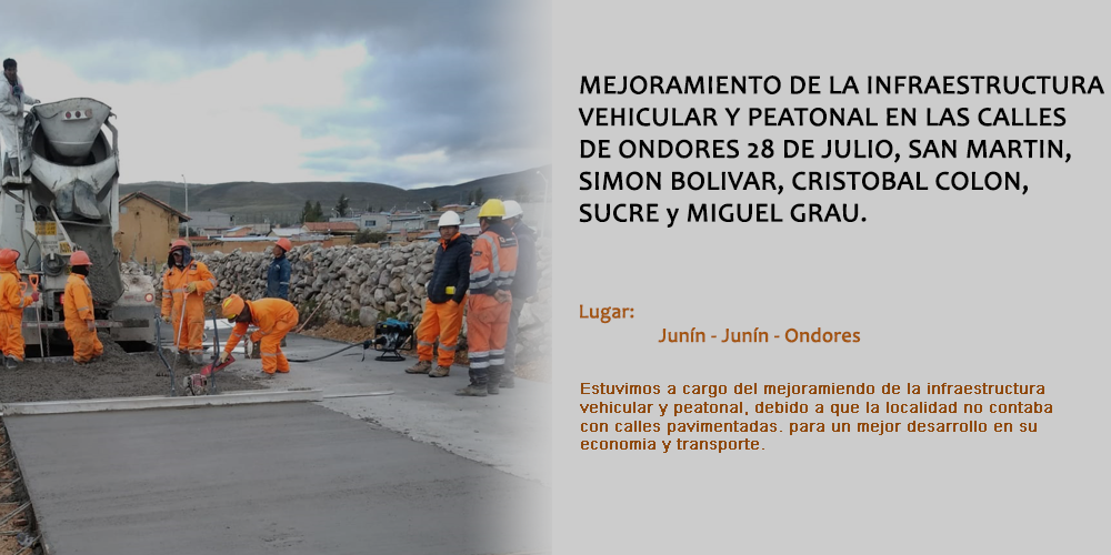 Anterior Siguiente NUESTROS SERVICIOS Servicios Mineros MANTENIMIENTO ELECTROMECANICO DE PLANTAS CONCENTRADORASAMPLIACIÓN DE PLANTAS CONCENTRADORAS.CONSTRUCCIÓN INDUSTRIAL.INSTALACIÓN Y CAMBIO DE FORROS LIFTER Y METÁLICOS DE MOLINOS INDUSTRIALES Anterior Siguiente Anterior Siguiente Servicios Civiles VÍAS TERRESTRES y URBANISTICO.OBRAS HIDRÁULICAS.OBRAS SANITARIAS.EDIFICACIONES. ALQUILER DE EQUIPOS Anterior Siguiente ALGUNOS TRABAJOS REALIZADOS Anterior Siguiente NUESTROSCLIENTES SOCIOSCOMERCIALES Síguenos Facebook Youtube CONTACTANOS Nombre *Correo *TeléfonoMensaje *ENVIAR